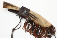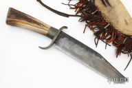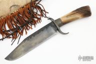 This Bowie by Master Smith Daniel Winkler features a heat colored clip point blade with forged finished flats and a framed tang. .215" Blade Stock.  1.76" Blade Depth. The handle features steel guard and spacer complimented by pinned stag and matching buttcap. Includes a leather and rawhide sheath. Light oxidation/patina and scratches are visible on the blade/handle otherwise the knife is in good condition.