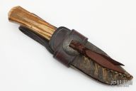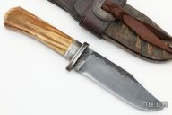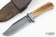 If you're not familiar with Master Smith Dan Winkler's knives, take a close look at this one. Dan crafts blades in the 18th century woodsman tradition and some of his pieces look to be museum displays. This Belt Knife features a clip point blade with forged textured flats and a fileworked thumbrest, .238" blade stock and 1.335" blade depth, hidden tang construction. The handle has a pinned stag grip. Rawhide covered leather sheath with fringe and tin cones. Beautiful piece for collectors and re-inactors alike. Has some light scratches, and patina, handle has some cracks. Good condition otherwise.