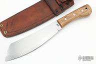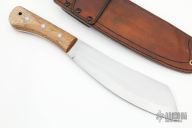 This Parang made by Dave Beck features a hand rub satin finished blade with full tang construction, .180" blade stock and 2.203" blade depth. The handle has hickory scales. Comes with a brown leather sheath. New condition.