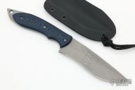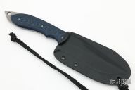 This Fighter by Neil Blackwood features a bead blast finished spear point blade with a notched thumb rest and a full tang construction. .160" Blade Stock.  1.415" Blade Depth. The handle features G10 Scales. Comes with kydex sheath, has edom light scuffs, otherwise Excellent Condition.