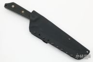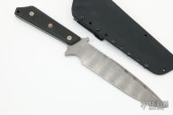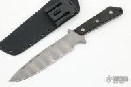 This Fighter by Mick Strider features a tiger striped blade with sharpened top edge and notched thumbrest, .241" blade stock and 1.58" blade depth, full tang construction with a Lego g10 handle. Comes with kydex sheath. Has a couple scratches and blemishes, otherwise excellent condition. RARE BOS BG-42