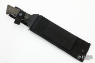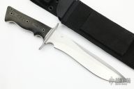 This Model 2 by Walter Brend features a double hollow ground blade with hand rub satin finish, and a 4" sharpened top edge, .261" blade stock and 1.716" blade depth, full tang construction. The handle has a satin finished titanium double guard, and black canvas micarta scales, hollow tube pins and lanyard hole. Comes with a black nylon sheath. This knife is beautiful and sports the "Cullman Co., AL." logo. Excellent condition. #012 on the blade. Comes with a zippered case.