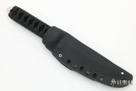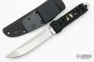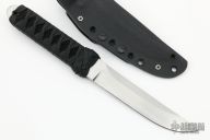 This knife by Don Polzien features a hand rub satin finished blade, with swedge, .24" blade stock, .96" blade depth with hidden tang construction. The handle has a Turk's head knot as a guard, and a wrapped handle over stingray skin. Comes with a Kydex sheath. Has some light scratches, excellent condition.