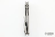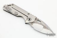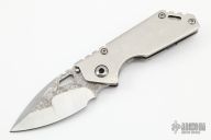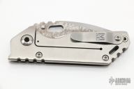 This 3/4 AR by Mick Strider features a two-tone Nightmare Ground blade with notched thumbrest and thumbhole. The handle has an orange peel finished titanium frame with a matching titanium tip up clip. Nice detent, lockup and blade seating. Has a couple light scratches on the clip, otherwise excellent condition. Comes with a zippered case.
