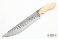 This Camp Chopper by Samuel Lurquin features a hand rub satin finished blade with beautiful hamon, .211" blade stock and 1.829" blade depth, full tapered tang construction with fossil walrus ivory scales and domed pins. Coems with a zippered case. The scales have shrunk a little exposing the tang, otherwise excellent condition.