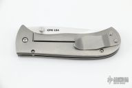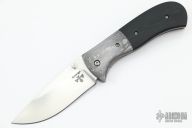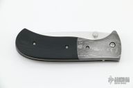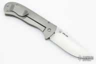 This custom FM1 by Les George features a hand rub satin finished blade with dual thumbstuds. The handle has a dovetailed Damascus bolster, black G-10 scale, tumbled titanium frame and tip up clip. Nice detent, lockup and blade seating. Has a few light scratches, otherwise excellent condition. Comes with a zippered case.