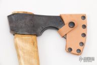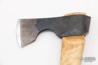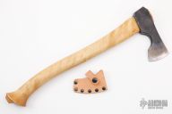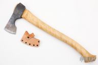 This Camping Axe by Martti Malinen features a hand forged 2LB axe head with hammer poll. The handle is birch wood and is 20" long. Comes with a leather blade sheath. Has been lighting used, otherwise excellent condition.