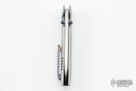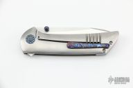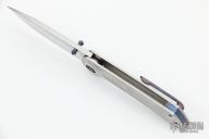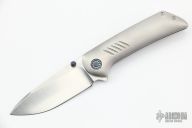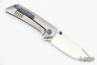 This Pheonix by Frank Fischer features a satin finish drop point blade with zircuti thumbstuds. The handle has a orange peel finish titanium frame, custom milled titanium pivot with zircuti inlays, zircuti tip up clip with hidden screws and backspacer. Nice detent, lockup, action and blade seating, rides on bearings. Comes with a zipper case. Excellent condition.