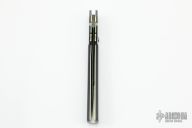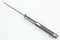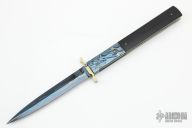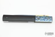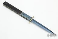 This one-of-a-kind XXL Swing-Guard by Reese Weiland features a blued Damascus blade with false top edge, anodized titanium swing-guard, blued Damascus bolsters, desert ironwood scales, jeweled and anodized titanium liners, stainless steel backspacer with faux tortoise shell inlay over gold leaf. Button has a blue stone inlay. Nice action and blade seating, but the lock slips if you push negative pressure on the blade. Has a few very light scratches, otherwise excellent condition. Comes with a zippered case.