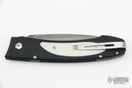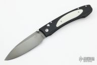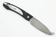 This E10 folder by William Henry features a drop point black finished D2 blade with a single thumb stud.  The frame is T6061 aluminum with two white G-10 inlays complemented by a stainless steel tip down pocket clip. Comes with original box and papers dated Jan 28,2013 and #076. This knife is very difficult to open and the pivot screw is very tight, i was unable to loosen it. Otherwise excellent condition.