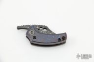 This Wasp Friction Folder by Koch Tools features a Chad Nichols Armor Core San Mai Damascus blade with swedge, notched thumbrest and friction bar. The handle is comprised of mokuti scales over a titanium barrel spacer. Lanyard hole in pommel. Comes with a brown pocket sheath and COA dated 12/27/18. Excellent condition.
