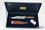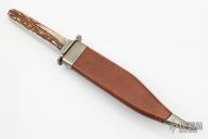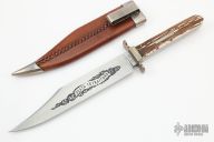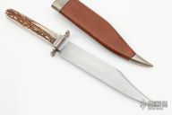 This Bowie by Dalian and Hanwei features a hand rub satin finished blade with .159" blade stock and 1.262" blade depth, full tang construction. The handle has a nickel silver guard and collar with stag scales. Comes with original box and brown leather and nickel silver scabbard. Excellent condition.