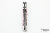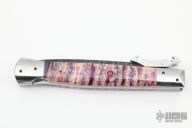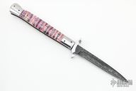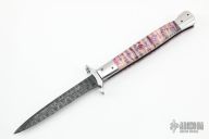 This swing-guard auto by Burn Knives features a Damascus bayonet ground blade with a false top edge. The handle has stainless bolsters and swing guard, pink mammoth ivory  scales, anodize titanium liners, and a stainless steel backspacer. Comes with a zipper case. Has some light scratches on the bolsters and release button, otherwise excellent condition.