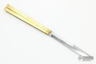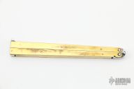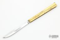 This balisong from the Philippines features a spear point blade with a satin finish and false top edge. The handle has brass scales and brass channel construction, aluminum T-latch. Has scratches and patina, but that is normal for these. Excellent condition.