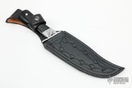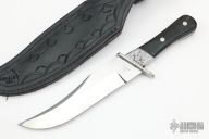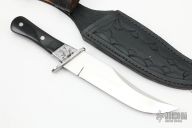 This Wayne Hensley Cowboy Bowie has a mirror finished blade with a thickness of .193" and a blade depth of 1.528". Full tapered tang construction with buffalo horn scales and stainless guard and bolsters. The guard/bolsters/pins have been engraved. Knife comes with a hand tooled black leather sheath with belt loop. Has some rust on the guard/bolsters, otherwise good condition.