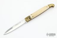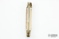This leverlock auto features a satin finished blade with a fileworked blade spine and spring. The handle has brass bolsters and butt, stag scales and brass liners. Has some scratches, otherwise excellent condition.