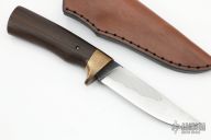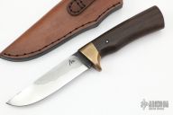 This Hunter by Murad Custom Knives features a hand rub satin polished drop point blade with nice hamon, .184" blade stock and 1.109" blade depth, hidden tang construction. The handle has a brass guard and a Japanese Rosewood grip. Comes with a brown leather sheath and COA. New from maker.