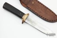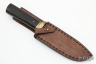 This Belati Knife by Murad Custom Knives features a hand rub satin polished drop point blade with nice hamon, .118" blade stock and 1.128" blade depth, hidden tang construction. The handle has a brass guard and a Japanese Rosewood grip. Comes with a brown leather sheath and COA. New from maker.