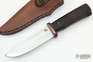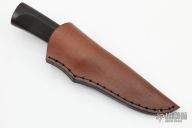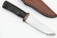 This Belati Knife by Murad Custom Knives features a hand rub satin polished drop point blade with nice hamon, .123" blade stock and 1.156" blade depth, hidden tang construction. The handle has a brass guard and a Japanese Rosewood grip. Comes with a brown leather sheath and COA. New from maker.
