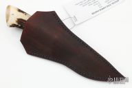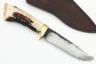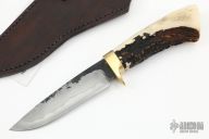 This Hunter by Last Knives features a hand rub satin finished blade with a nice hamon and forge finished flats, .163" blade stock and 1.130" blade depth, hidden tang construction. The handle has a brass guard and a stag grip. Comes with a brown leather sheath and COA. New from maker.