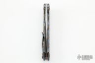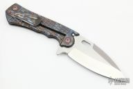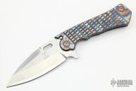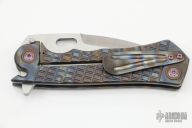 This knife by Steve Ryan features a satin finished spearpoint blade with thumbhole and flipper. The handle has a flame anodize finish milled titanium frame and matching tip up clip. Nice detent, lockup and blade seating. Has a few light scratches, otherwise excellent condition.
