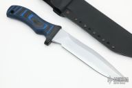This Voodoo Hound by Mad Dog Knives features a double edged blade with .248" stock and 1.406" blade depth. Selectively tempered, the knife has a Rockwell C-scale hardness of 62 at the edge (as hard as a file), and HRC 50-54 throughout the spine and hidden full tang. Hard chrome blade finish. The handle is designed to be ergonomic and has the ability to withstand tremendous punishment with little or no damage. It is hard and tough enough to be used as an impact tool. Includes a kydex sheath with belt loop. Excellent condition.