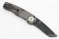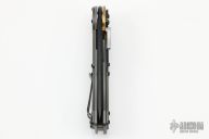 This is a knife from the GH-Series Gearhead folding knife by Mantis Knives. The "steampunk-style" Gearhead liner lock folder is equipped with a unique gear-driven pivot with one large gear, three small gears and a thumb lever used to deploy the blade when pushed down. It features a flat 3.38" plain edge tanto blade and measures just under 5" when closed. The gray handle scales are made from aluminum with a stainless steel backspacer and tip-up pocket clip. The GH2022TBS Gearhead comes in a black stonewashed finished blade but is available in a variety of styles and finishes.