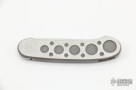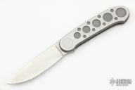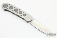 Barry Wood design for Pacific Cutlery. This is a very unique scissor opening folder, which when the blade is fully open and locked in place is almost a fixed blade knife. Opening is accomplished by lighting pressing down and outward at the rear indentation on the spine, which releases the locking pin and allows one side of the handle and the blade to rotate down then forward until the blade locks in the forward position. The one side of the handle continues to rotate back until it locks in place. Closing requires the same slight thumb pressure at the indentation to release the locking pin, then the one side of the handle is rotated back and around, catching the blade and aligning both with the other side of the handle in a locked closed position. Stonewashed blade with bead blasted stainless steel scales. Has a couple light scratches, otherwise excellent condition.