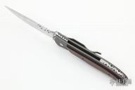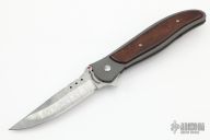"I've been a part time knifemaker since 1988. I became a member of the Knifemaker's Guild in 1999. I am also a member of the Northeast Cutlery Collectors Association (NCCA). I specialize in linerlock folders. The frames are made from 6AL4V titanium. For overlay handle material I have used just about everything from exotic woods, pearl, ivory, G-10 and Micarta. The blades, which I feel is the most important part of the knife, I try and use the best steel available. For my stainless steel blades I use ATS-34, BG42 and I am starting to use S30V, professionally heat treated to 59-60Rc. I use some carbon steel damascus by George Werth however for everyday carry knives I use more stainless damascus. My preference is Damasteel which is produced in Sweden and sold by Michael Walker. I've also used steel by Devin Thomas and Mike Norris. Most of my knives are made in 3" and 4" blade lengths in both right and left hand models. I also have a couple of new patterns available made with a patented "Rip Cord" mechanism. It is an out the front mechanical knife that has a metal strip that extracts the blade from the handle with a tug. The metal strip also called the 'key' can be reinserted into the knife to unlock the blade and let it retract back into the handle."
