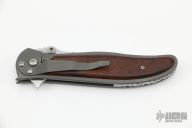 This linerlock flipper by John Kubasek features a Damasteel blade with fileworked spine and dual thumbstuds with a ruby inset. The handle has desert ironwood burl scales, bead blasted titanium liners/frame, fileworked Damasteel backspacer, tip down bead blasted titanium clip. Nice blade seating and lock up. Has a couple very light scuffs, otherwise excellent condition.
