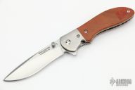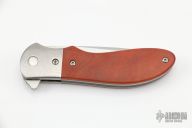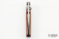 This Mini Cobra linerlock flipper by the Late Phil Boguszewski features a hand-rub satin finished recurve blade with a single thumbstud and a notched flipper. The handle has orange peel finished titanium bolsters, wood scales, satin finished titanium liners with jeweled interiors, black linen micarta backspacer. Nice detent, lockup and blade seating. Outstanding work. Excellent condition. #7