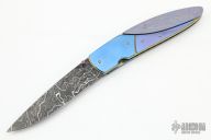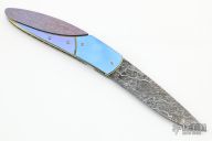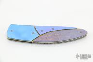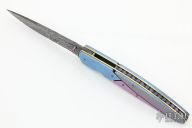 This linerlock by Theuns Prinsloo features a Damascus blade with a single anodized titanium thumbstud with ruby inlay. The handle has multi-piece anodized titanium scales, anodized and textured titanium liners, heat colored and fileworked stainless steel backspacer. Has carving on the scales and inside the backspacer. Nice detent, lockup and blade seating. Has a few light scratches, otherwise excellent condition.