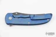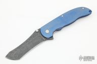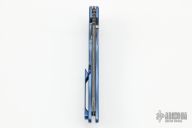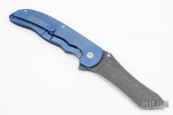 This Norseman (#5817) by John Grimsmo features a acid etched blade with a single titanium thumb stud, notched thumb ramp and flipper. Anodized and stonewash finished titanium frame with titanium screws. Has a matching clip with hidden screws. Very smooth action that requires no wrist movement. Nice detent, lockup and blade seating. Rides on ceramic bearings. Comes with original packaging, custom hard case, Nano-Oil, tool, and COA dated March 1, 2022. Excellent condition.