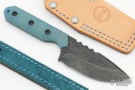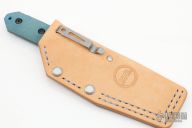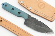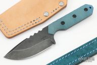 This Camper by Tactical Pterodactyl features a drop point blade with a dark stonewash finish, notched thumbrest, .151" blade stock and 1.580" blade depth, full tang construction. The handle has sculpted G-10 scales. Comes with a brown leather sheath and COA. Excellent condition.