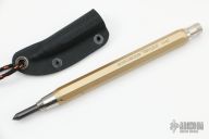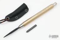 This spike pen features a black oxide finished spike that is deployed by pressing the button at the rear of the pen. This pen has been internally modified to accept and eject the spike with the push of the rear button. A piece of pencil graphite is positioned at the tip to conceal the spike. Works as a functioning pencil. New from maker. Very cleaver. Comes with a kydex neck sheath.