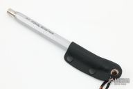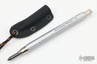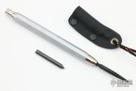 This spike pen features a black oxide finished spike that is deployed by pressing the button at the rear of the pen. This pen has been internally modified to accept and eject the spike with the push of the rear button. A piece of pencil graphite is positioned at the tip to conceal the spike. Works as a functioning pencil. New from maker. Very clever. Comes with a kydex neck sheath.