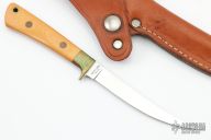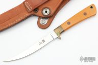 This 5003 Fisher by Al Mar features a mirror polished blade with notched thumbrest, .105" blade stock and .578" blade depth, full tapered tang construction. The handle has brass bolsters and yellow paper micarta scales with brass pins and lanyard hole. Comes with original box and leather sheath. Has some patina, otherwise excellent condition.