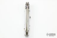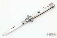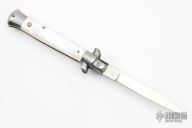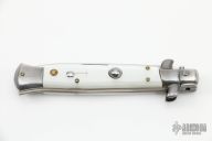 This Swivel Bolster Auto by Edgeco features a polished drop point blade with nail nick. The handle has stainless steel bolsters and butt, white scales, brass liners. Made in the 80-90s. Has some light scratches, otherwise excellent condition.