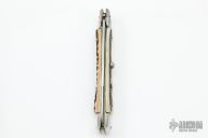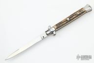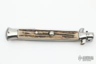 This Swivel Bolster Auto by Edgeco features a polished drop point blade with nail nick. The handle has stainless steel bolsters and butt, stag scales, D-stamp brass liners. Made in the 80-90s. Has some light scratches, otherwise excellent condition.