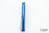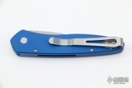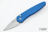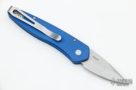 This Half Breed by Pro-Tech has a stonewashed blade with swedge. The handle has a blue aluminum frame with a black stainless steel pocket clip. Includes original box and papers. New from maker!