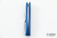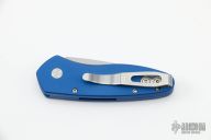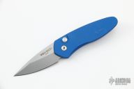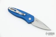 This Sprint by Pro-Tech has a stonewashed blade and a blue aluminum handle. Stainless steel clip. Comes with original box and papers. New from maker.