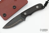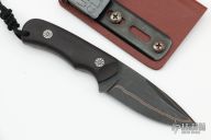 This RP-5 by Alex Garcia features a dark tumble finish drop point CuMai (1095 core) blade, with false top edge, .124" bladestock, .997" blade depth and full tang construction. The handle is comprised of copper space coral micarta, and mosaic pins. Comes with a kydex pocket sheath with ulticlip. Excellent condition.