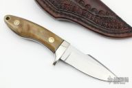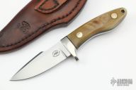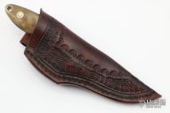 This Hunter by Chuck Schuette features a hand rub satin finished blade with notched thumbrest, .160" blade stock and 1.070" blade depth, full tapered tang construction. The handle has a nickel silver guard, sheep horn scales with black liners. Comes with a beautiful hand tooled brown leather sheath. New from maker.