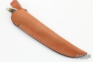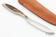 The belt Knife, by Grohmann Knives, features an upswept drop point blade with a notched thumb rest and a full tang construction. .101" Blade Stock .787" Blade Depth. The handle is composed of stag scales. Includes a brown leather sheath and the original box and papers. Excellent Condition.