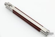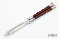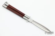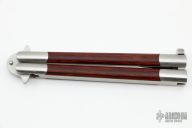 This balisong by 29 Knives features a satin finished double edged blade. The handle has integral 303 stainless steel handles with dovetailed rosewood inlays. Has scome scuffs and scratches on the blade and the t-latch. Good condition otherwise.