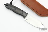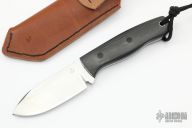 This Bear fixed blade by DitchPig Knives features a hand rub satin finished blade with notched thumbrest, .131" blade stock and 1.252" blade depth, full tapered tang construction. The handle has Boeing carbon fiber scales with black pins and black/green G-10 liners. Comes with a brown leather sheath. Has a few light scratches, otherwise excellent condition. #20 on blade. Heat treated by Peter's at 60hrc. The maker contacted us on this one and said he would gladly make a new kydex sheath for whoever buys this knife, just shoot him a message!