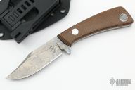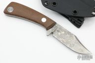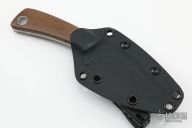 This TK-4 Mini Bowie by Tom Krein features an acid washed blade with notched thumbrest, .137" blade stock and .944" blade depth, full tang construction. The handle has brown canvas micarta scales with black liners. Includes Kydex sheath with TekLok. Has some light scratches, otherwise excellent condition.