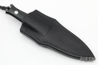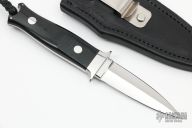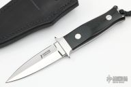 This Defender Prototype by John Young features a mirror finished double-edged blade, .193" blade stock and .921" blade depth, full tapered tang construction. The handle has mirror polished stainless steel guard, black linen micarta scales with red liners. Comes with a black leather sheath. Excellent condition.