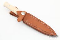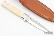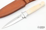 This Dagger by John Young features a mirror finished double-edged blade, .185" blade stock and .746" blade depth, full tapered tang construction. The handle has mirror polished stainless steel guard, mammoth ivory scales with red liners. Comes with a brown leather sheath. Excellent condition.