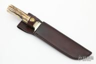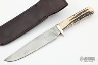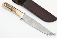 This knife by Bill Bullard features a Damascus clip point blade with .20" blade stock and 1.269" blade depth, full tang construction. The handle has a nickel silver guard and stag scales. Comes with brown leather sheath. Has some scratches and some oxidation on the blade, otherwise good condition.